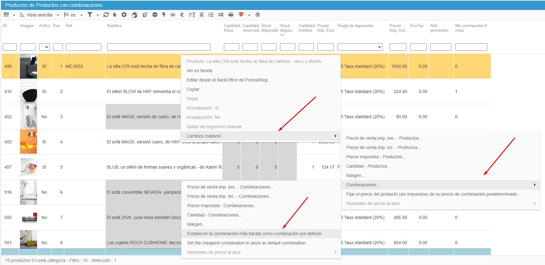 Cuando esté en la parrilla de productos (parte central de la interfaz), seleccione uno o varios productos con combinaciónes y, a continuación, haga clic con el botón derecho del ratón > cambios masivos > combinaciónes > Establecer la combinación más barata como combinación por defecto.