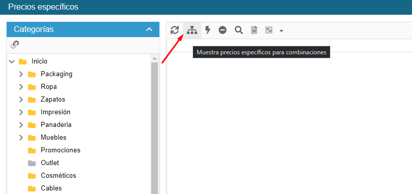 A continuación, seleccione una categoría en la que tenga productos con precios especiales. Para visualizar los precios especiales de sus variaciones, haga clic en este icono de la barra de herramientas: