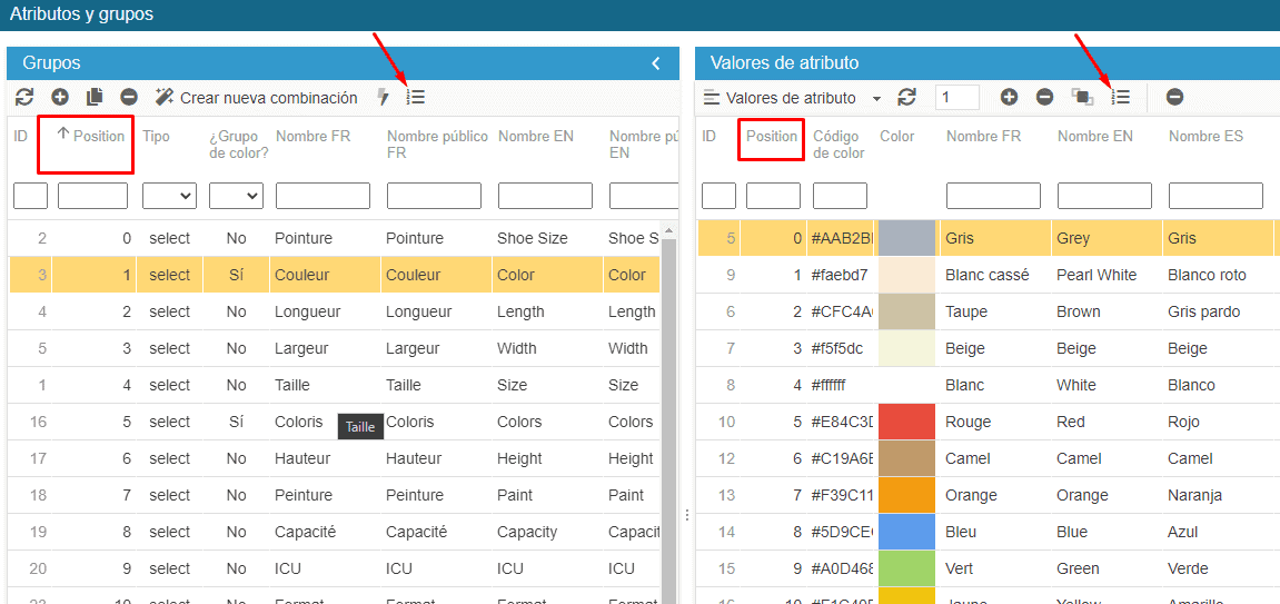 Una columna "Posición" se muestra igualmente para permitir modificar el orden de visualización de los grupos y de los atributos sin tener que aplicar este orden en el front office.