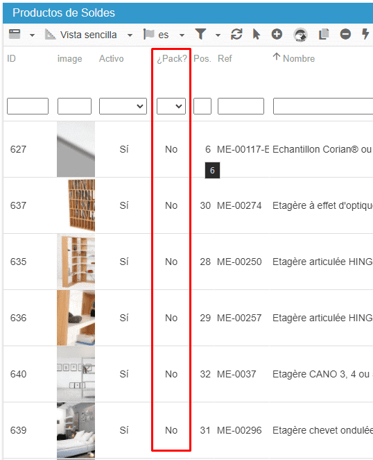 La columna central de los productos de Sc muestra una columna "Pack?" que le permite identificar rápidamente los productos que son packs.