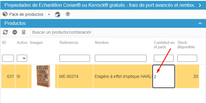 Cuando el producto se encuentra y se añade, puede indicar las cantidades que desea en este pack - la columna "Cantidad disponible" le indica el stock actual.