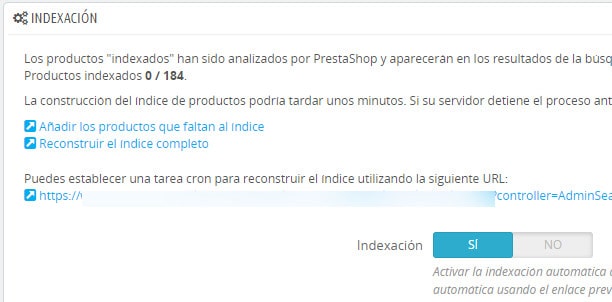 Al ser gestionado el motor de búsqueda de su sitio web por PrestaShop, la operación se realiza directamente en el backoffice > Preferencias > Búsqueda.
