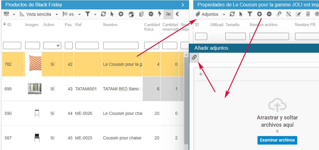 La gestión de los documentos adjuntos en Store Commander está accesible en la tabla del mismo nombre desde la columna de Propiedades, a la derecha.