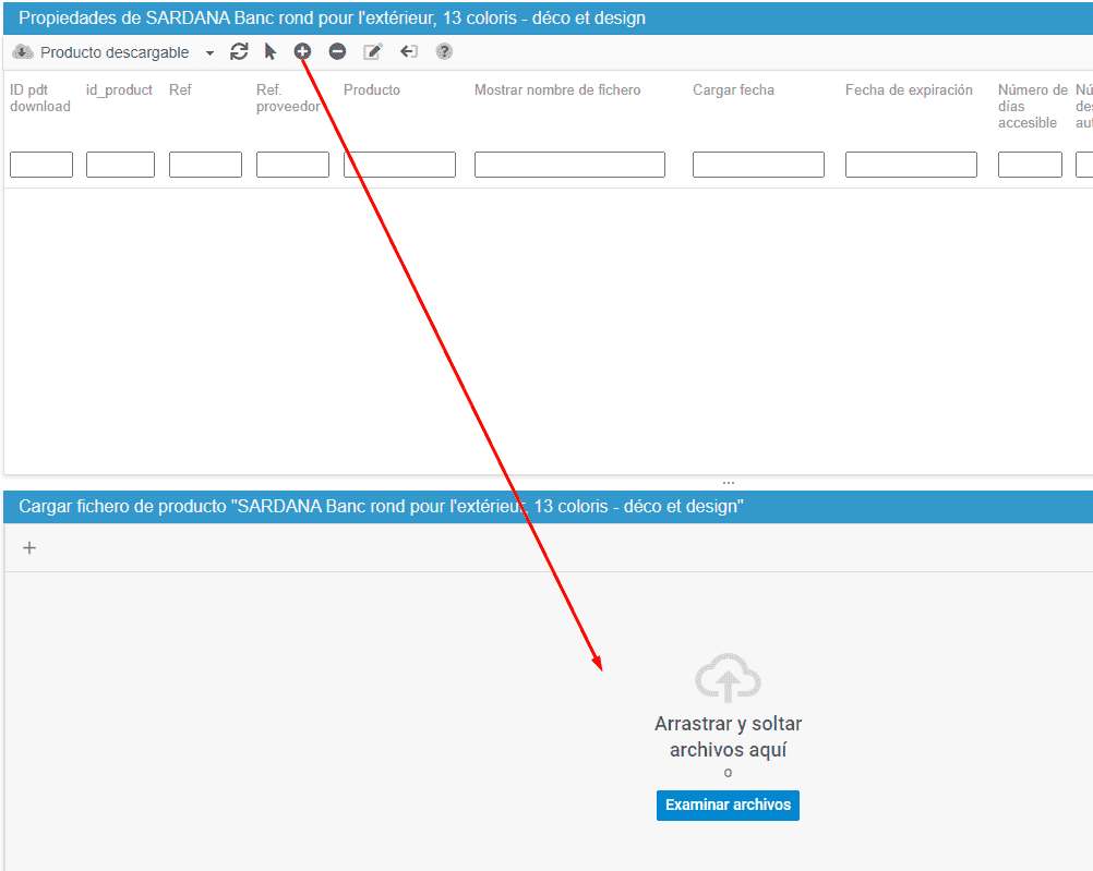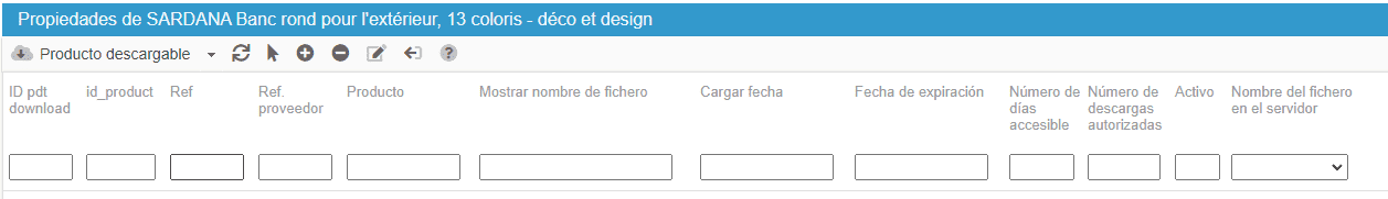 Puede gestionar los Productos Descargables, es decir, los productos digitales de PrestaShop, en la tabla del mismo nombre en la columna de las Propiedades, a la derecha.