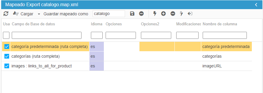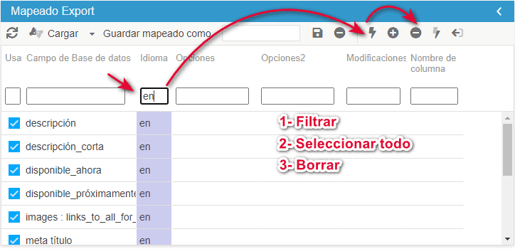 En este tutorial, solo tendremos en cuenta los campos del idioma FR (francés). Si se muestran varios idiomas en el mapeado, se deben filtrar los campos de los idiomas que se eliminarán del mapeado.