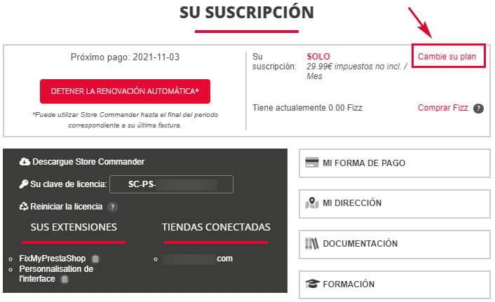 Si desea cambiar su plan actual de Solo a Solo+ o de Solo a MultiStore, o a MultiStore+, vaya a la página de Abono de su cuenta y haga clic en el enlace "Cambie su plan".