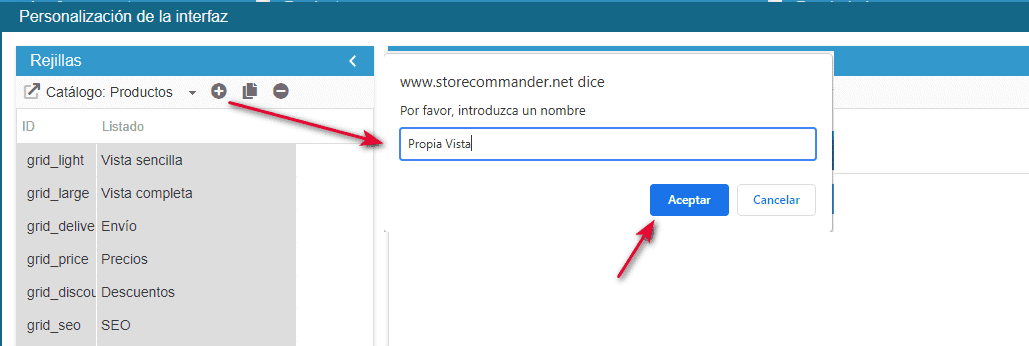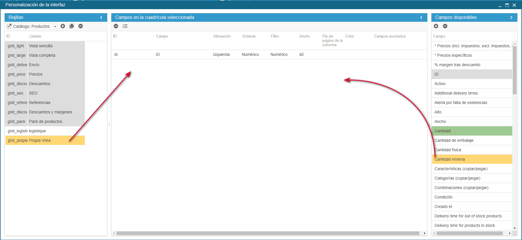 La herramienta de personalización de la interfaz le permite crear nuevas vistas en la columna central de todas las interfaces de Store Commander con los campos que desee mostrar.