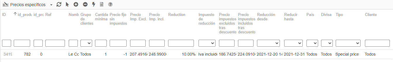 Esta tabla le permite gestionar los precios de los descuentos para productos elegidos.