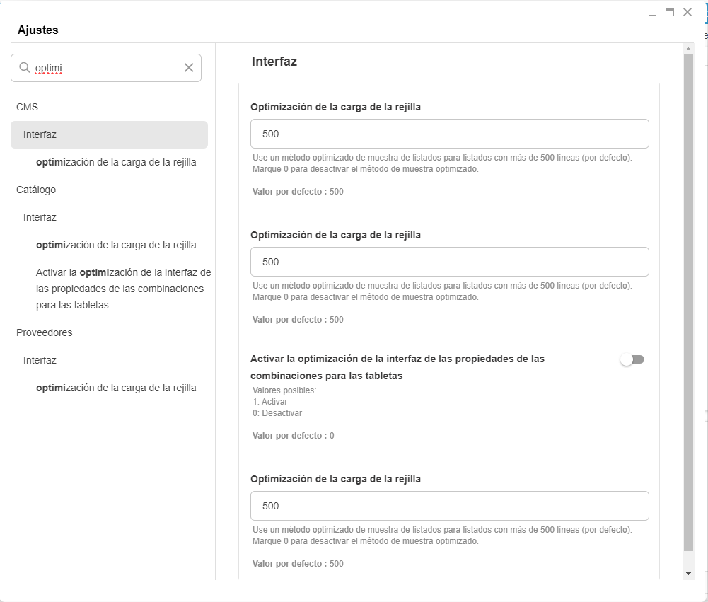 Para superar este problema de visualización, Store Commander le permite optimizar la carga de sus productos en las rejillas de la interfaz gracias a su opción en Herramientas > Ajustes > Interfaz > Optimizar la carga de la rejilla: