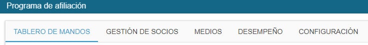El colaborador se conectará a su cuenta en la web del vendedor y luego seleccionará "Mis Afiliados y Mis Comisiones". Se mostrarán 5 pestañas en la página de inicio: panel de control, medios, comisiones, afiliados y rendimientos.