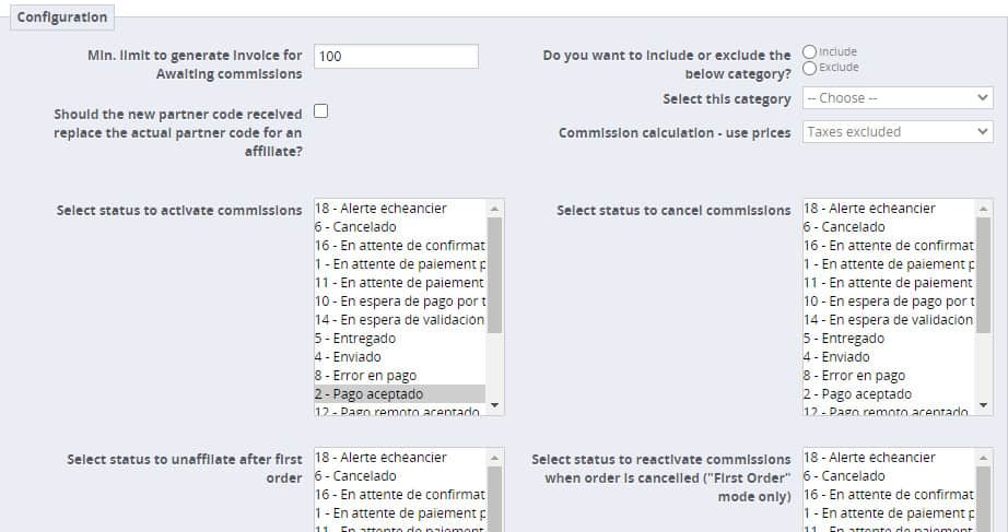 Aquí, podrá determinar el umbral a partir del cual los colaboradores pueden recibir sus comisiones. Pero también algunas acciones sobre las comisiones en cuanto a los estados de los pedidos. También podrá incluir o excluir una categoría de producto de su programa de afiliación.
