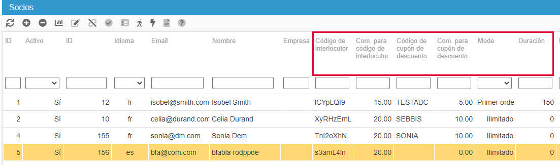 Se muestra el nombre del colaborador y se añaden automáticamente un código de colaborador aleatorio así como el 10 % de comisión. Puede modificar esta información y añadir cualquier otra requerida haciendo doble clic en cada celda para editarla.