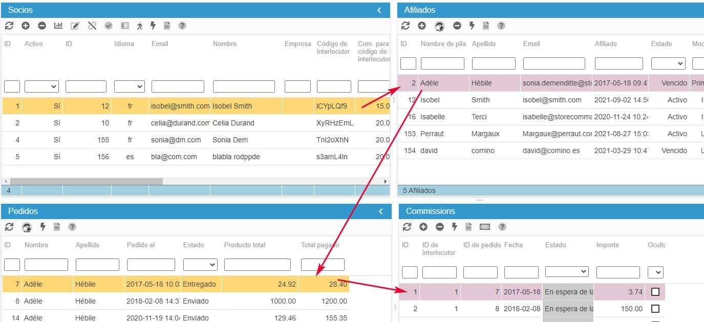 Se utiliza un código de color cuando selecciona un afiliado, las comisiones correspondientes a sus pedidos están marcados en rosa en el panel de las comisiones. El principio de multiselección también es aplicable en este caso.