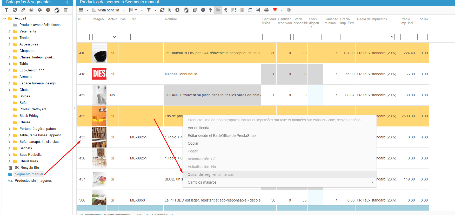 1. Visualice los productos del segmento, seleccione el o los productos y haga clic derecho en el o los productos > Eliminar del segmento manual