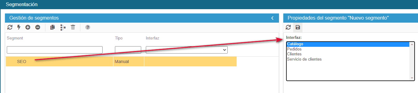 En el panel de la derecha, haga su selección antes de guardar. Aquí queremos mostrar el segmento sólo en la interfaz del Catálogo.