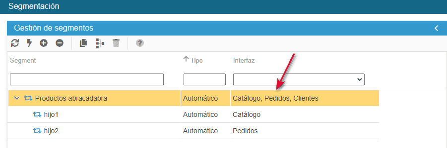 En este ejemplo, el segmento hijo (Abracadabra Commands) está asociado a la interfaz Commands, que no está asociada al segmento padre (Abracadabra Products).