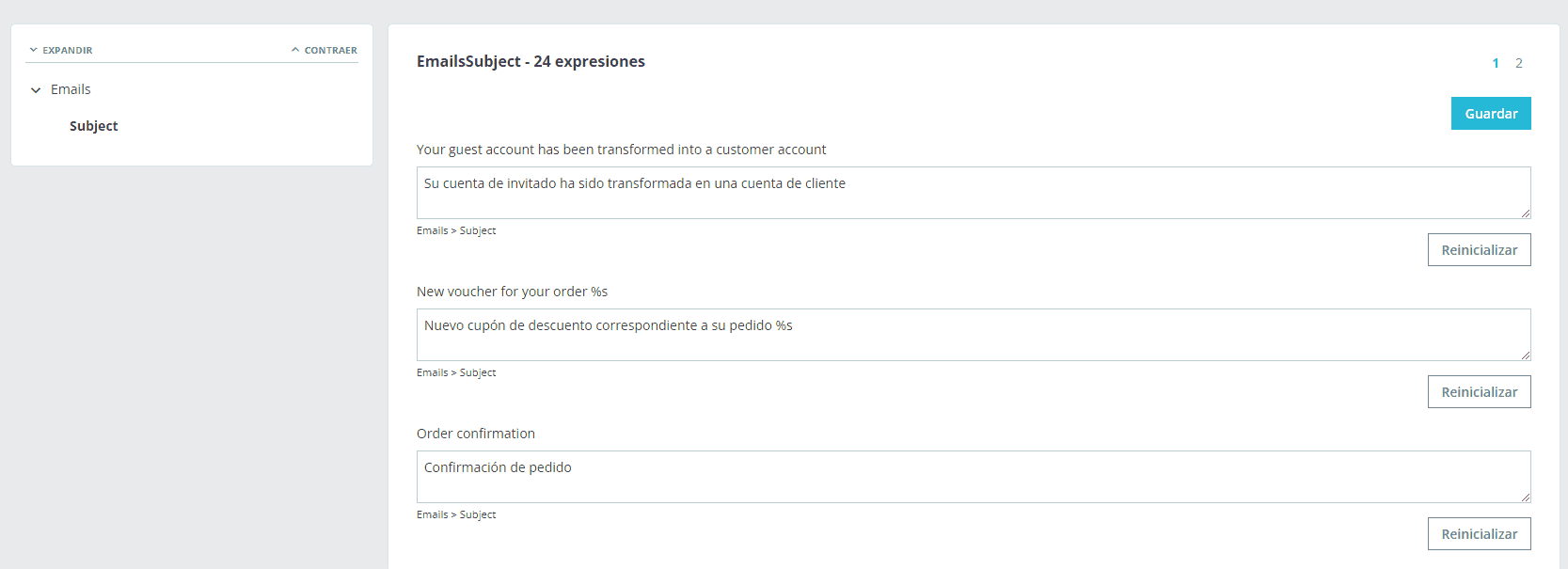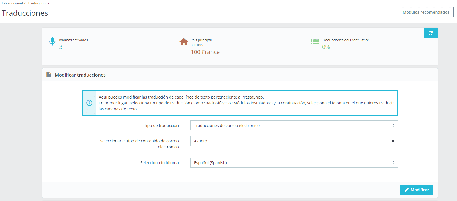 Seleccione "Traducciones de modelos de emails" y haga clic en la bandera española
