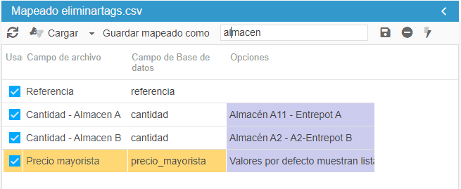 Si los productos están asociados a un almacén, el nombre de este almacén se seleccionará en la columna "Opciones" del mapeo.