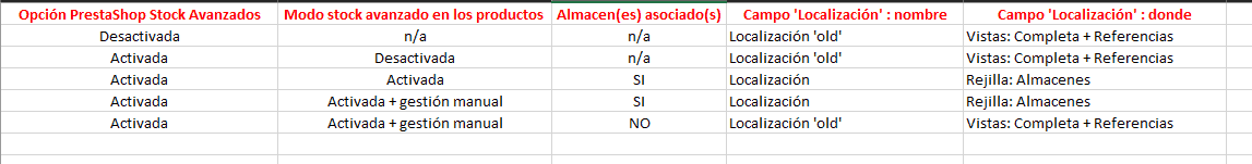 Para las versiones PrestaShop 1.5.x y 1.6.x, el campo "Ubicación" depende de sus opciones de administración de inventario avanzado, que se muestran en la siguiente tabla.