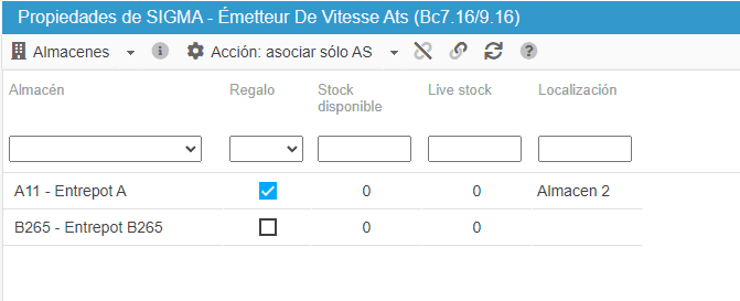 La grilla "Almacenes" que se encuentra en la columna Propiedades, a la derecha, le permite asociar productos a los almacenes simplemente marcando la casilla "Presente" de los almacenes correspondientes, después de haber seleccionado el producto/los productos a asociar.