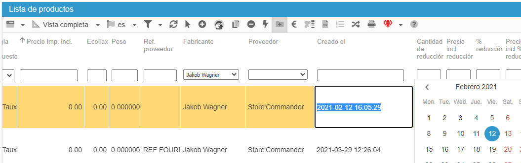 Después, edite la fecha de creación del primer producto de la lista con la fecha del día