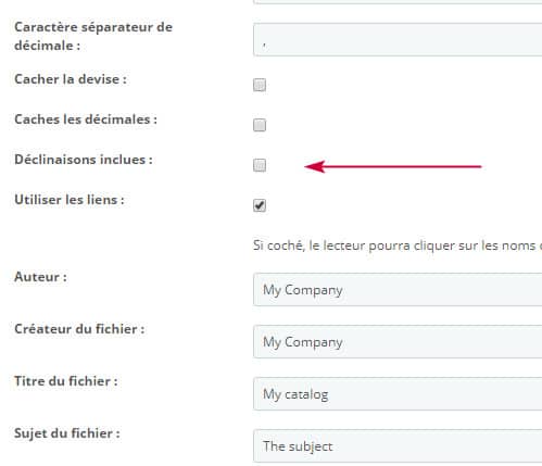 Puis, dans tous les formats LISTE, vous trouverez une option intitulée 'déclinaisons inclues' que vous pouvez activer pour inclure les déclinaisons dans votre catalogue.