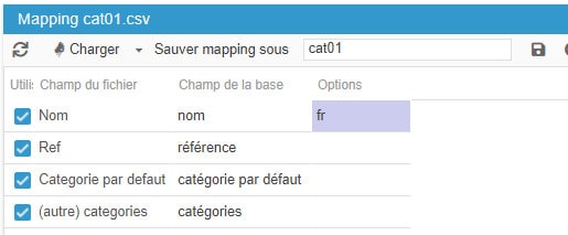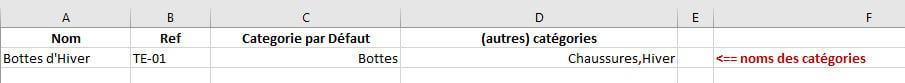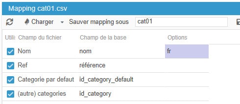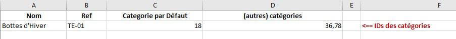 Etant donné qu'un produit peut se trouver dans plusieurs catégories, et l'une d'elles sera la catégorie par défaut (référencement SEO), deux champs sont disponibles à l'import :