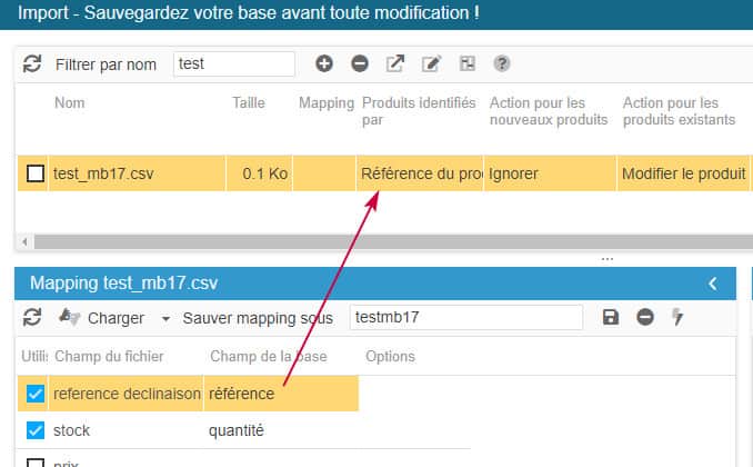 Dépendant de l'identifiant choisi, ici nous utilisons la référence des déclinaisons, voici l'exemple d'un fichier, son mapping et les options à utiliser dans la fenêtre d'import de Sc :