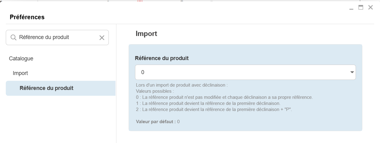 1 : les références sont ajoutées aux déclinaisons, la référence du produit parent sera identique à sa première déclinaison [REF01 - REF01]