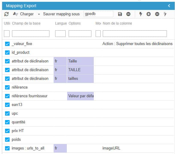 Sélectionnez les options dans le panneau principal : id_product + ignorer + modifier