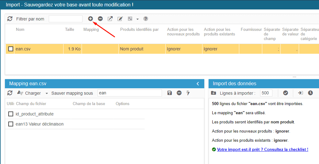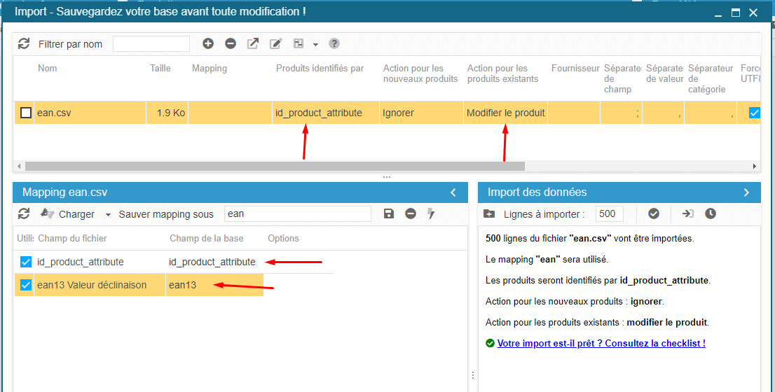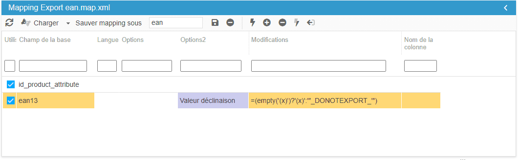 Dans le mapping, ajoutez les champs id_product et ean13. Pour le champ ean13 :