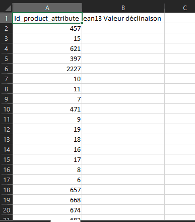 NOTE : n'oubliez pas de modifier le format de la colonne EAN pour que ceux là apparaissent comme des chiffres classiques et non scientifiques.