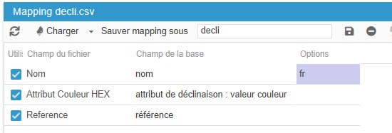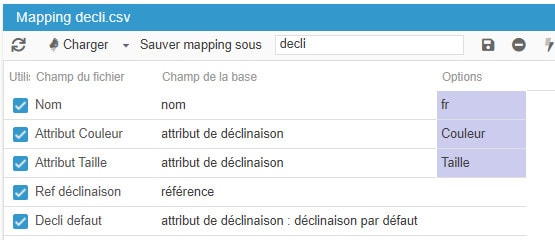 Le groupe d'attribut correspondant devra être sélectionné dans la colonne Options du mapping.