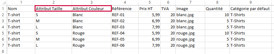 Le fichier CSV devra inclure le nom du produit et une colonne pour chacun des groupes d'attributs de déclinaisons. Les cellules contiendront le nom des attributs.