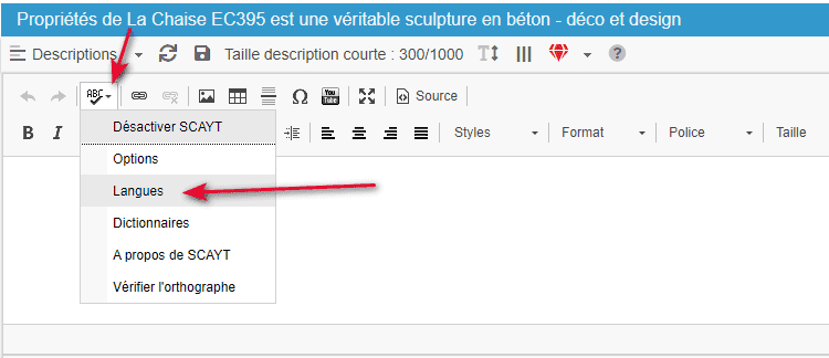 Vous pouvez choisir la langue de l'éditeur de texte utilisée dans le panneau des descriptions qui se trouve dans la colonne des propriété à droite.
