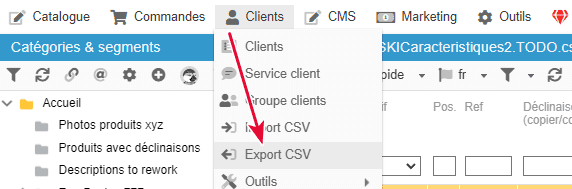 Pour accéder à l'outil Export Clients, rendez vous dans l'interface Store Commander > Clients > Export CSV.
