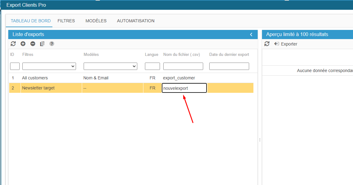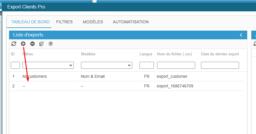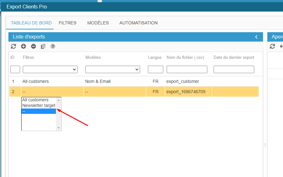 Ce sera sur le TABLEAU DE BORD, que vous choisirez un filtre et un modèle qui définiront votre fichier d'export.