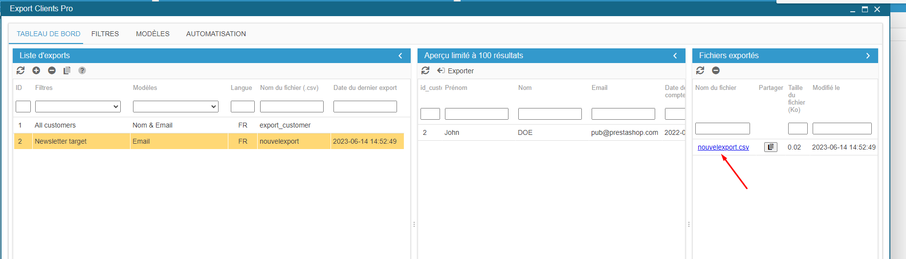 Le fichier exporté sera alors disponible dans la troisième colonne - cliquez sur le lien pour le télécharger.