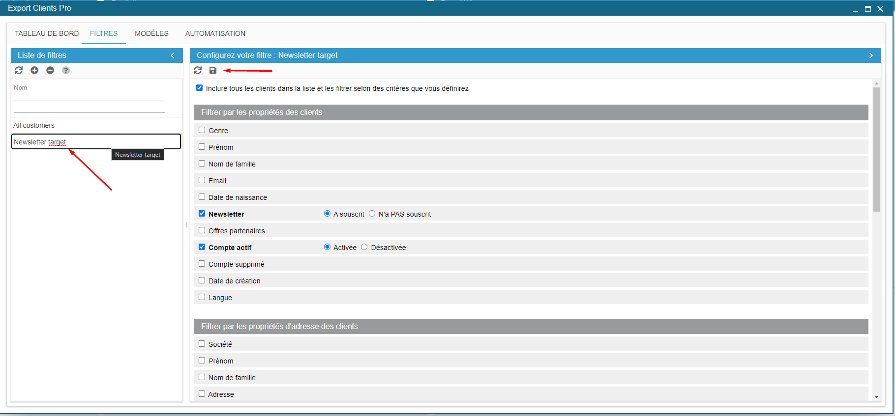 Une liste de filtres permet de prendre en compte les clients de votre boutique selon les critères que vous aurez définis dans les filtres (inscription newsletter, date de création, date de commandes, etc).
