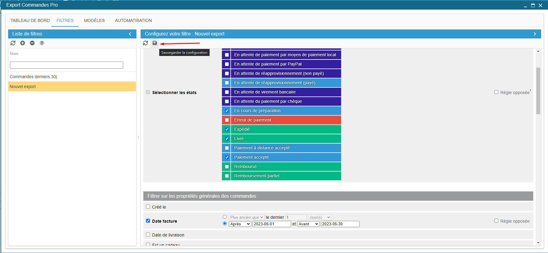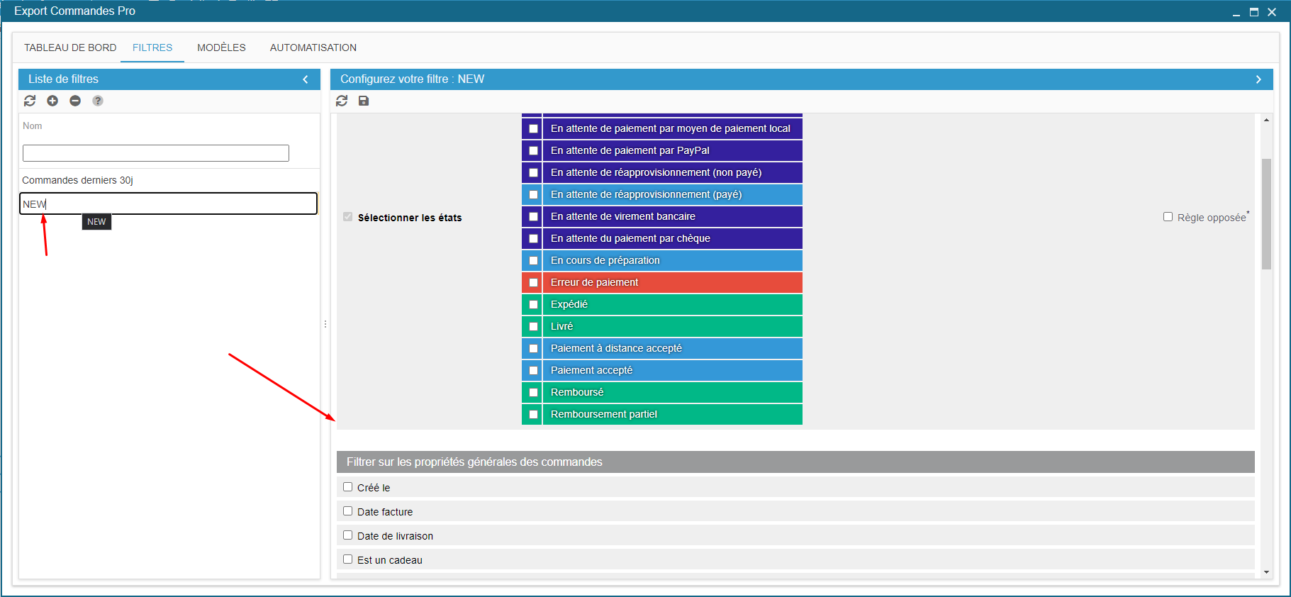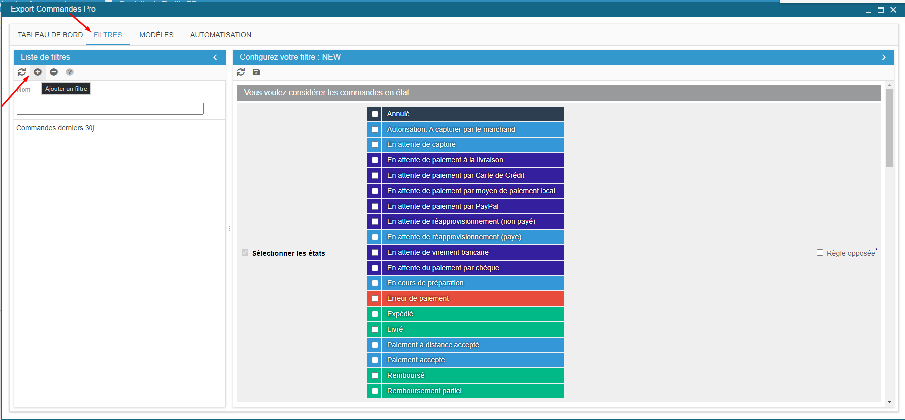 Rendez vous dans l'onglet FILTRES puis créez une liste de commandes filtrées en cliquant sur le bouton