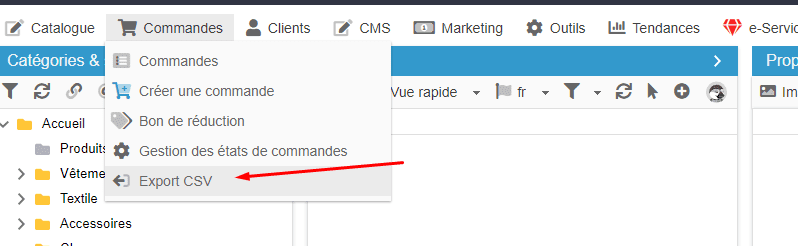 Pour accéder à l'outil d'Export Commandes PRO, rendez vous dans l'interface Store Commander > Commandes > Export CSV.