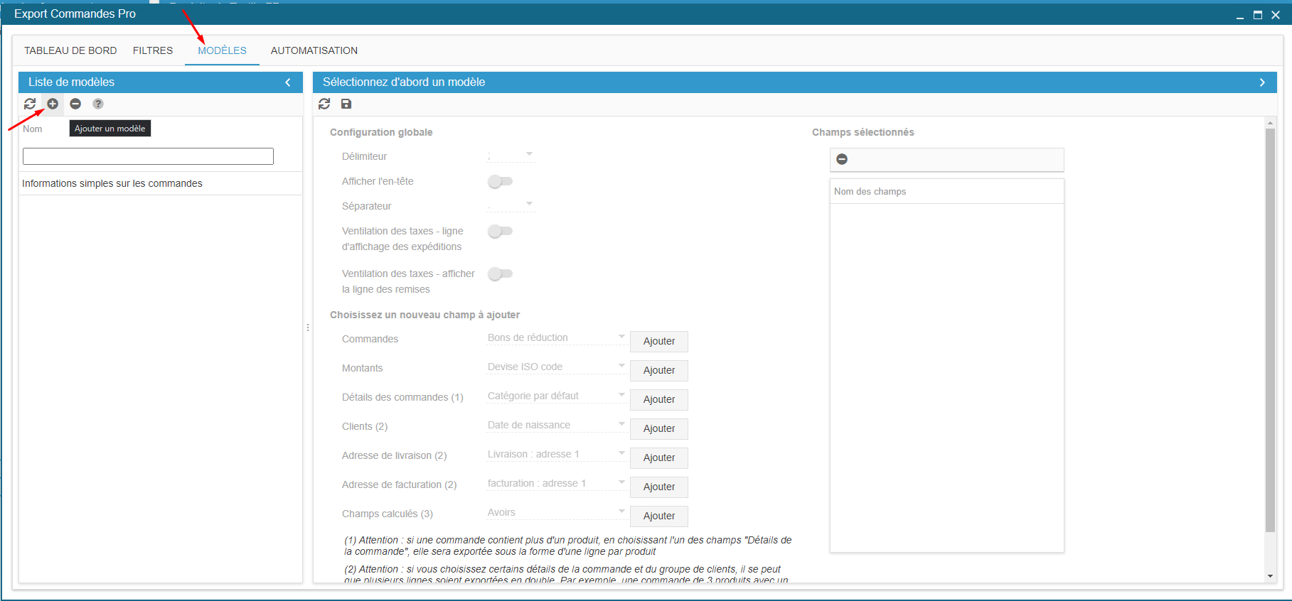 Nommez votre template d'export puis ajouter les champs que vous souhaitez exporter parmi ceux disponibles dans les différents menu déroulant.