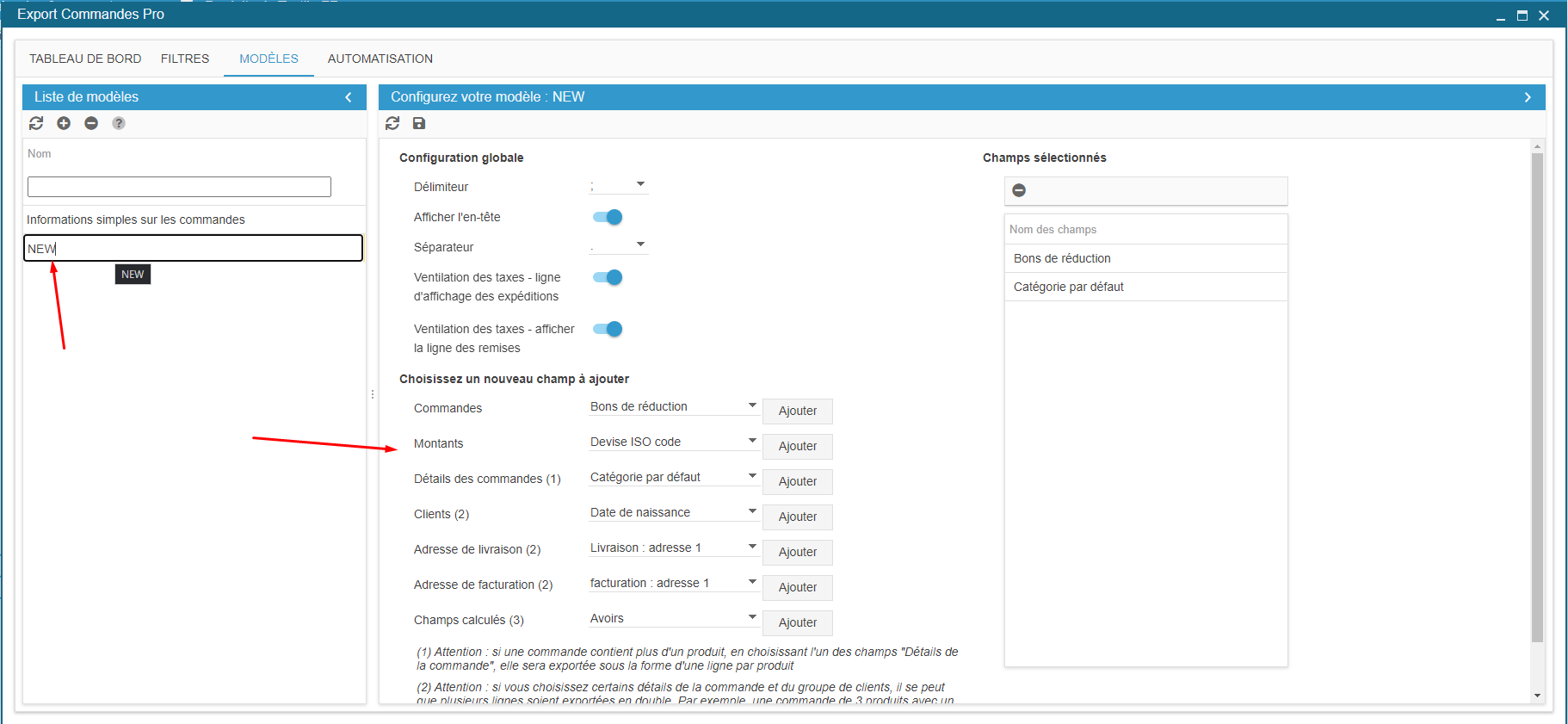 Note 1 : si vous incluez des champs produits, du menu Détails des commandes', alors votre fichier affichera 1 ligne par produit, et non 1 ligne par commande. Les totaux des colonnes ne seront donc pas corrects.