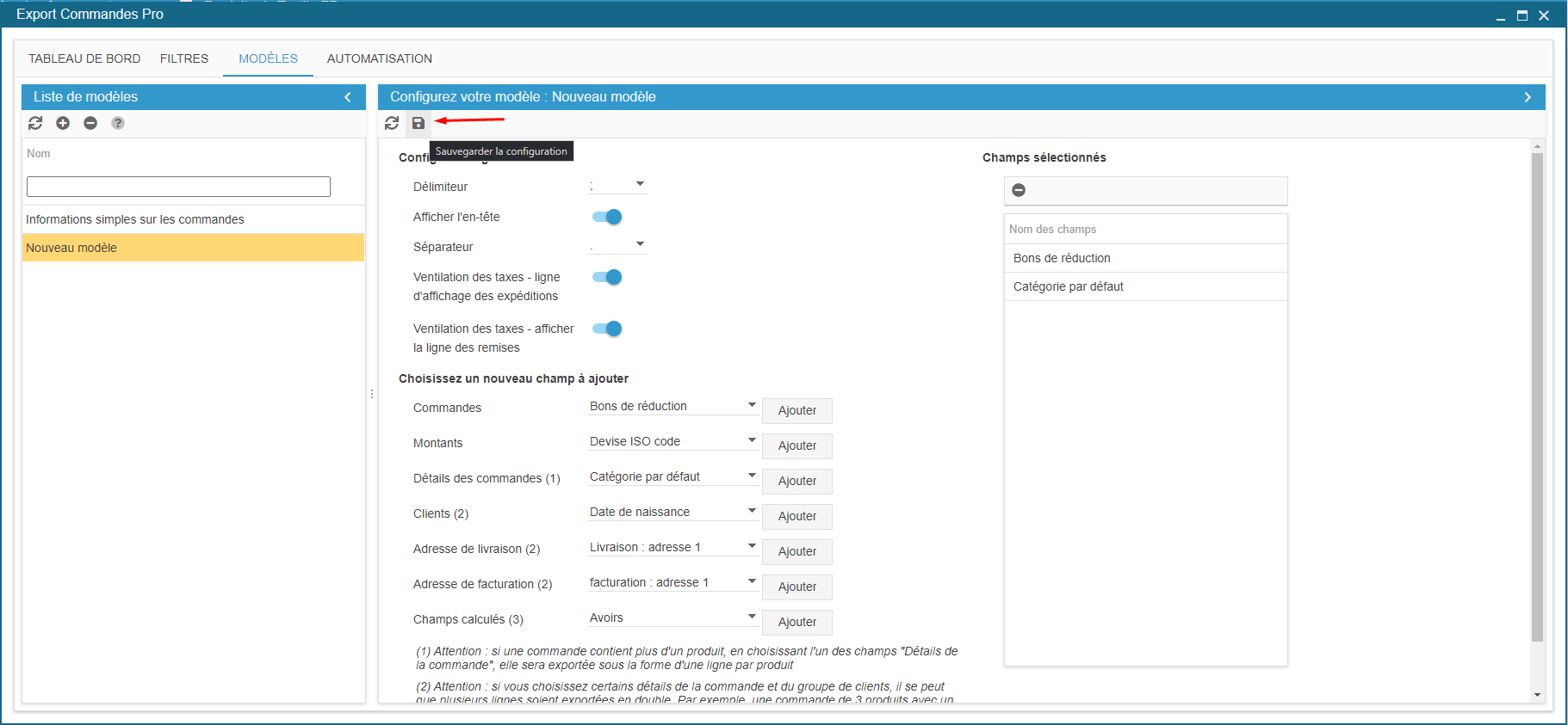 Une fois votre sélection de champ faite, n'oubliez pas d'enregistrer votre template en cliquant sur l'icône