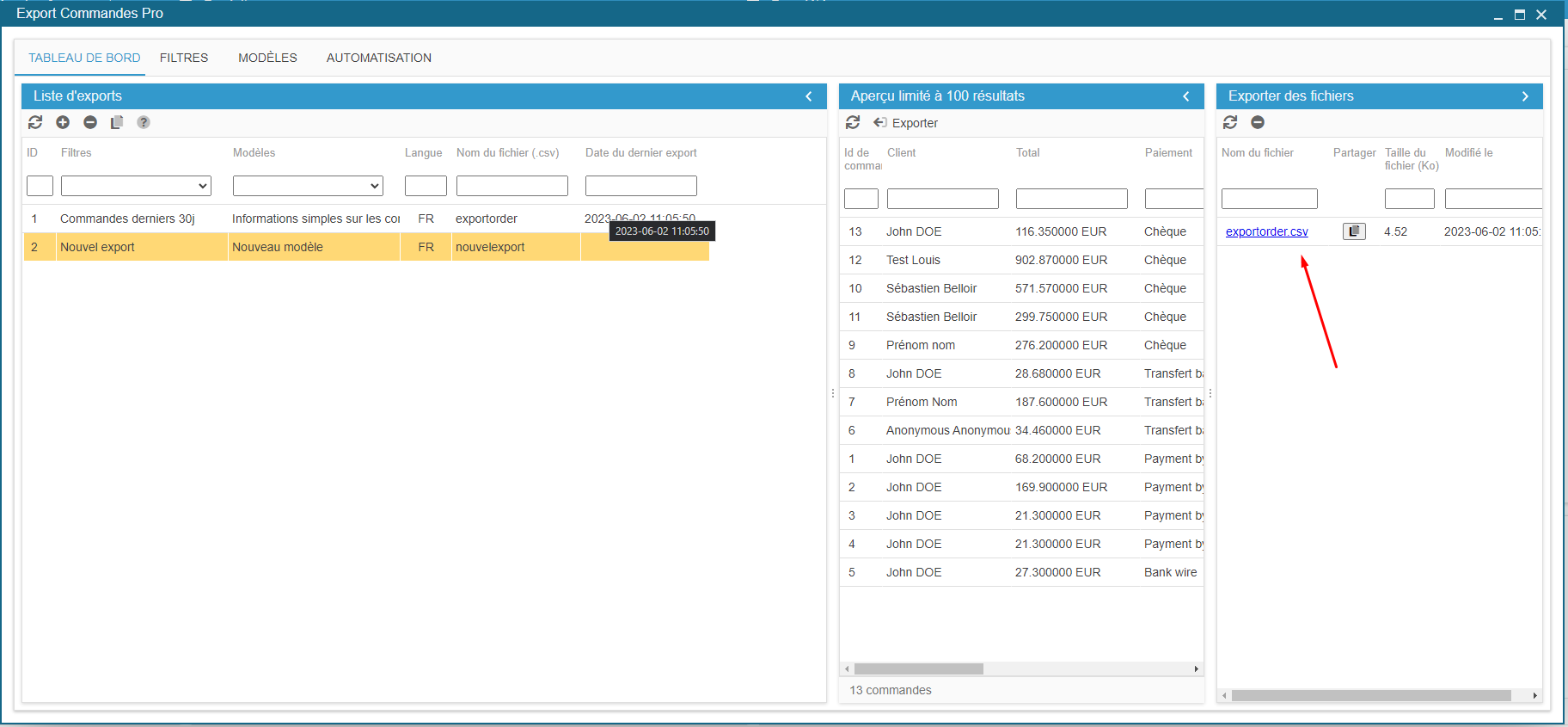 Lorsque le fichier sera généré, vous pourrez cliquer sur ce dernier dans le panneau "Exporter des fichiers".