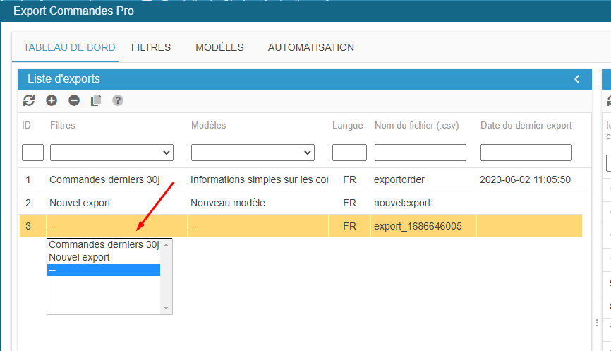 Sélectionnez le filtre, le modèle ainsi que la langue d'export en double cliquant dans les cellules (menu déroulant).