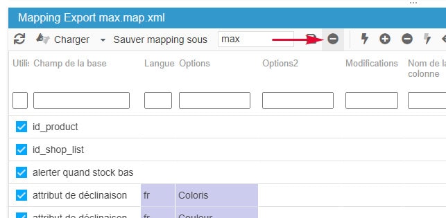 Pour supprimer des mappings d'export, vous pouvez charger le mapping concerné et cliquer sur l'icône de suppression :