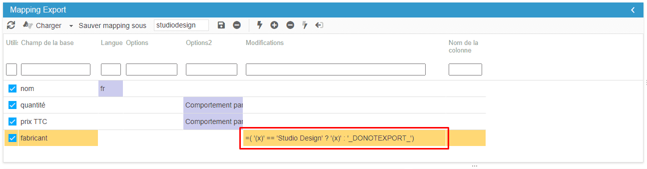 Dans la colonne "Modifications" de mon mapping, je vais utiliser cette formule =( '(x)' == 'Studio Design' ? '(x)' : '_DONOTEXPORT_') afin d'exporter seulement les produits de la marque.