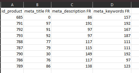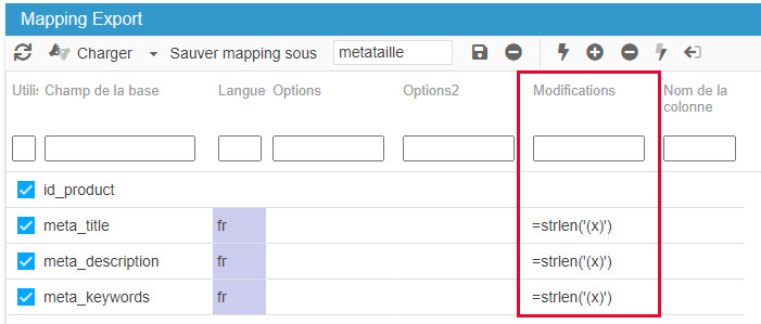 Si vous souhaitez exporter la taille des champs SEO, meta titre, meta description et meta keywords, vous pouvez insérer une formule dans le champ 'Modifications' du mapping d'export comme sur la capture ci-dessous.