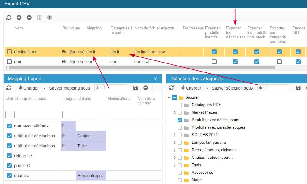 Renseignez le nom du mapping ainsi que le nom de votre sélection de catégories, et surtout l'option 'exporter les déclinaisons' dans le panneau principal dans la partie supérieure.